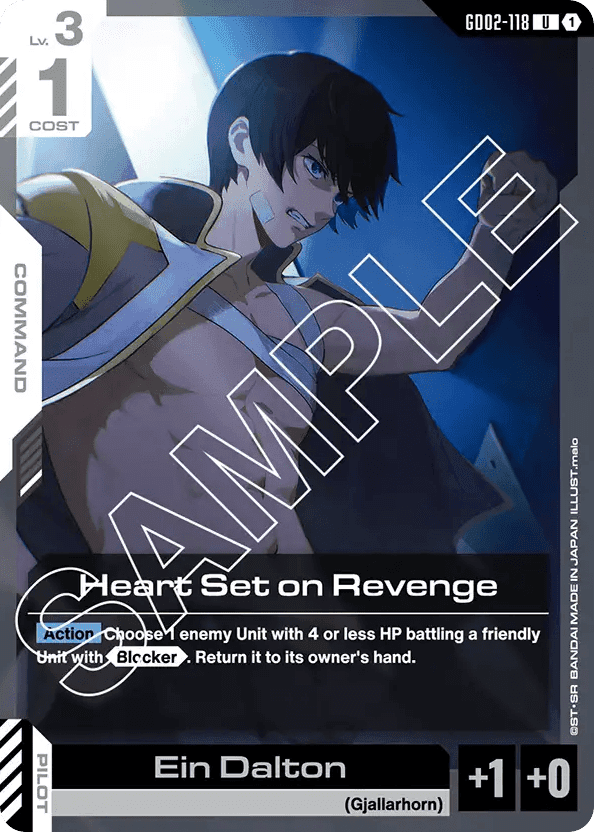 - [Action] Choose 1 enemy Unit with 4 or less HP battling a friendly Unit with <Blocker>. Return it to its owner's hand. — [Pilot] [Ein Dalton]