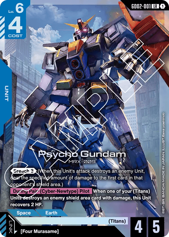 - <Breach 3> (When this Unit's attack destroys an enemy Unit, deal the specified amount of damage to the first card in that opponent's shield area.) — [During Pair・(Cyber-Newtype) Pilot] When one of your (Titans) Units destroys an enemy shield area card with damage, this Unit recovers 2 HP.