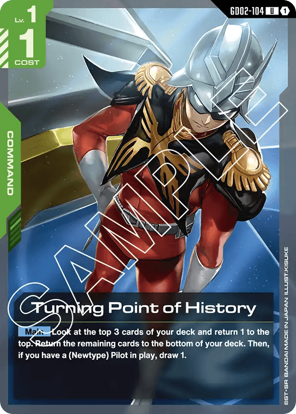 - [Main] Look at the top 3 cards of your deck and return 1 to the top. Return the remaining cards to the bottom of your deck. Then, if you have a (Newtype) Pilot in play, draw 1.