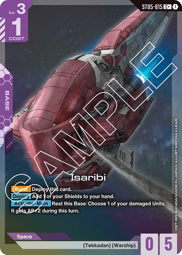 - [Burst] Deploy this card. — [Deploy] Add 1 of your Shields to your hand. — [Activate・Main] Rest this Base:Choose 1 of your damaged Units. It gets AP+2 during this turn.