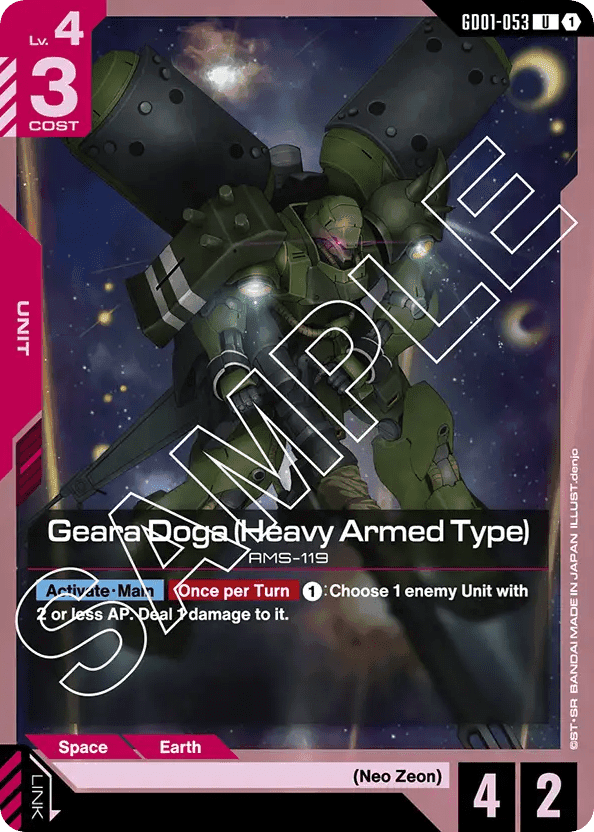 - [Activate・Main] [Once per Turn]①:Choose 1 enemy Unit with 2 or less AP. Deal 1 damage to it.