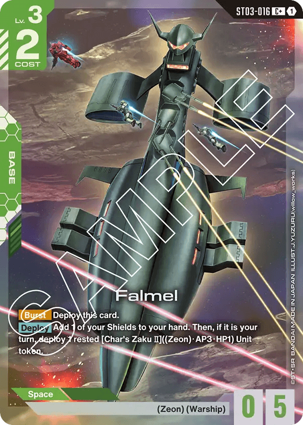 - [Burst] Deploy this card. — [Deploy] Add 1 of your Shields to your hand. Then, if it is your turn, deploy 1 rested [Char's Zaku Ⅱ]((Zeon)・AP3・HP1) Unit token.