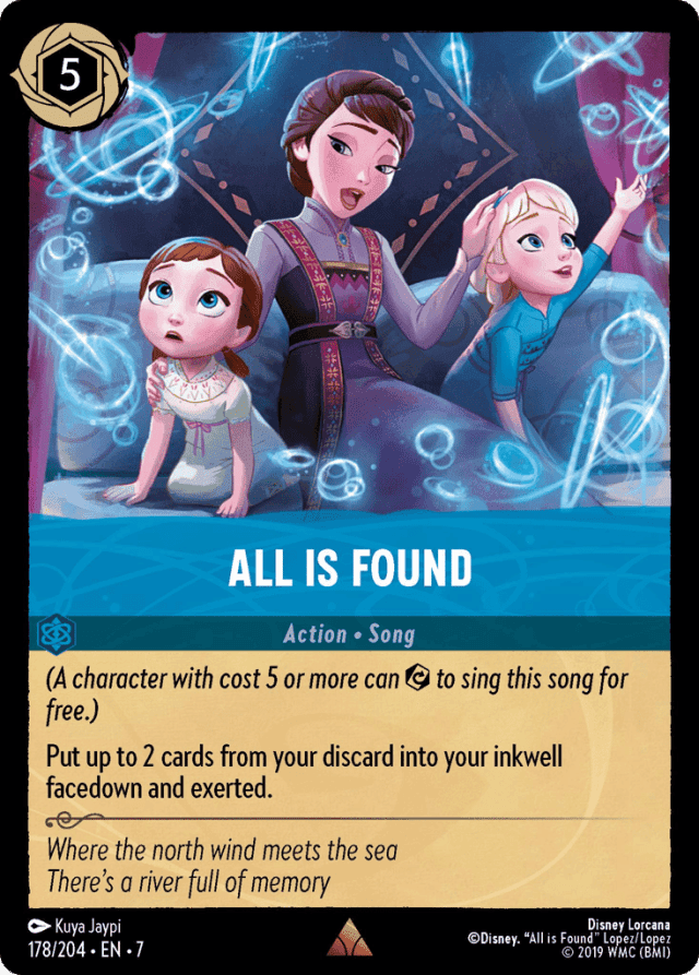 (A character with cost 5 or more can {Exert} to sing this song for free.) Put up to 2 cards from your discard into your inkwell facedown and exerted.