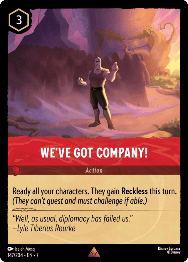 Ready all your characters. They gain Reckless this turn. (They can't quest and must challenge if able.)