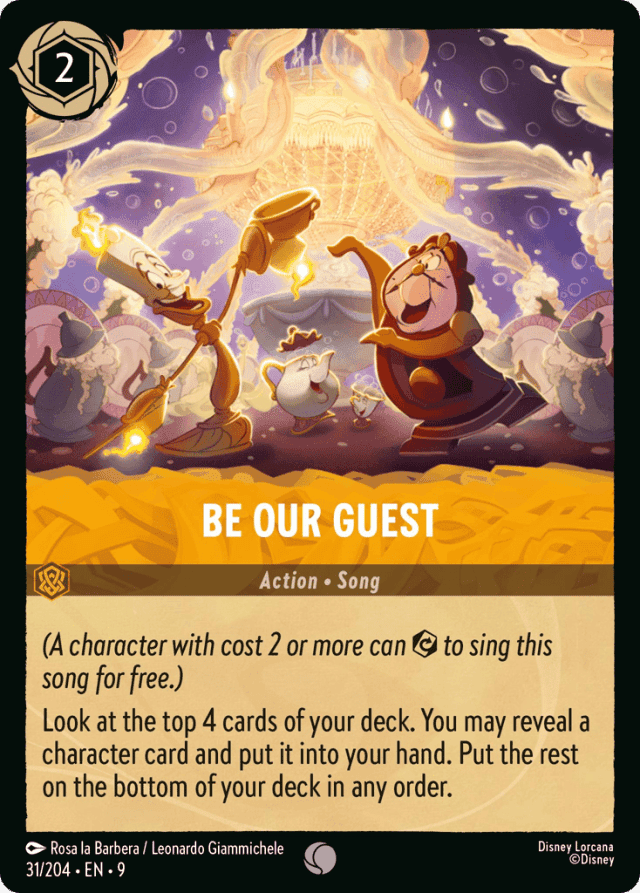 (A character with cost 2 or more can {Exert} to sing this song for free.) Look at the top 4 cards of your deck. You may reveal a character card and put it into your hand. Put the rest on the bottom of your deck in any order.