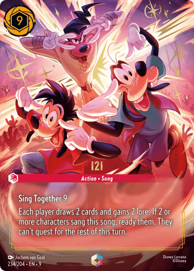 Each player draws 2 cards and gains 2 lore. If 2 or more characters sang this song, ready them. They can't quest for the rest of this turn.