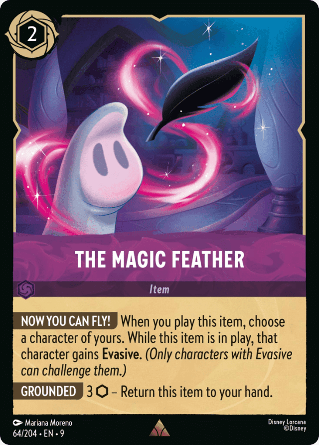 When you play this item, choose a character of yours. While this item is in play, that character gains Evasive. (Only characters with Evasive can challenge them.)
