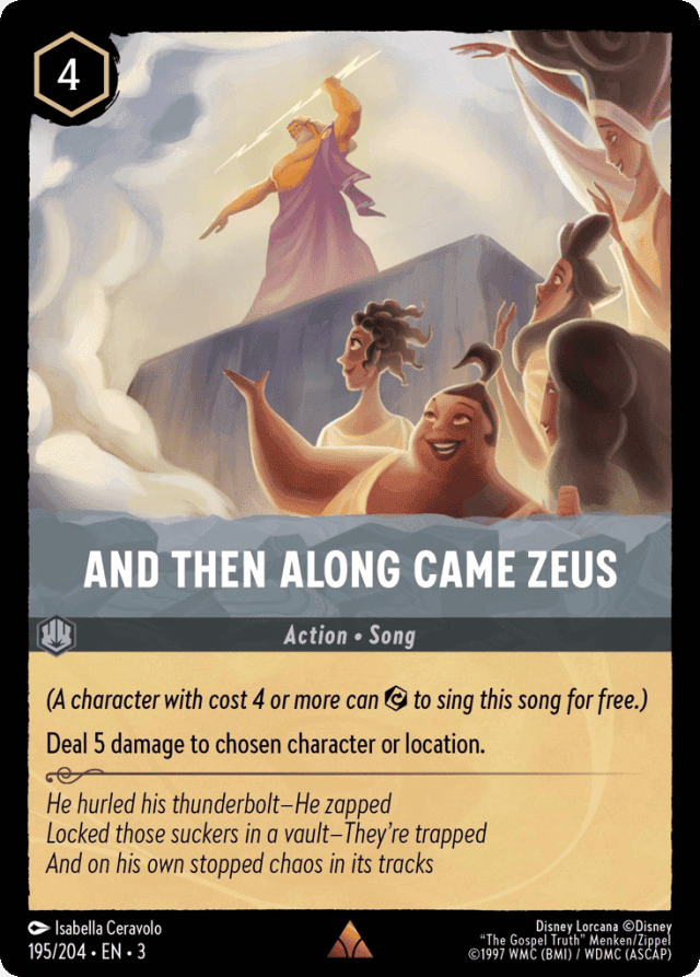 (A character with cost 4 or more can {Exert} to sing this song for free.) Deal 5 damage to chosen character or location.