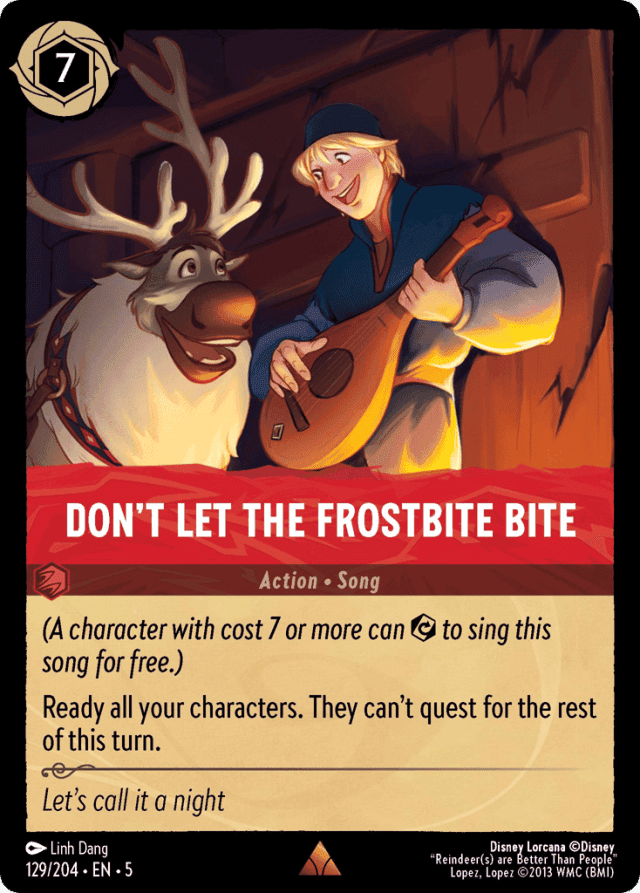 (A character with cost 7 or more can {Exert} to sing this song for free.) Ready all your characters. They can't quest for the rest of this turn.