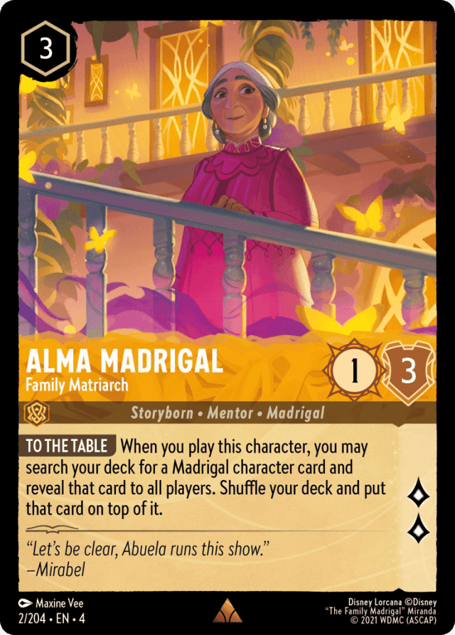 When you play this character, you may search your deck for a Madrigal character card and reveal that card to all players. Shuffle your deck and put that card on top of it.