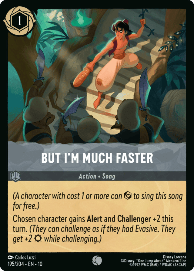 (A character with cost 1 or more can {Exert} to sing this song for free.) Chosen character gains Alert and Challenger +2 this turn. (They can challenge as if they had Evasive. They get +2 {Strength} while challenging.)