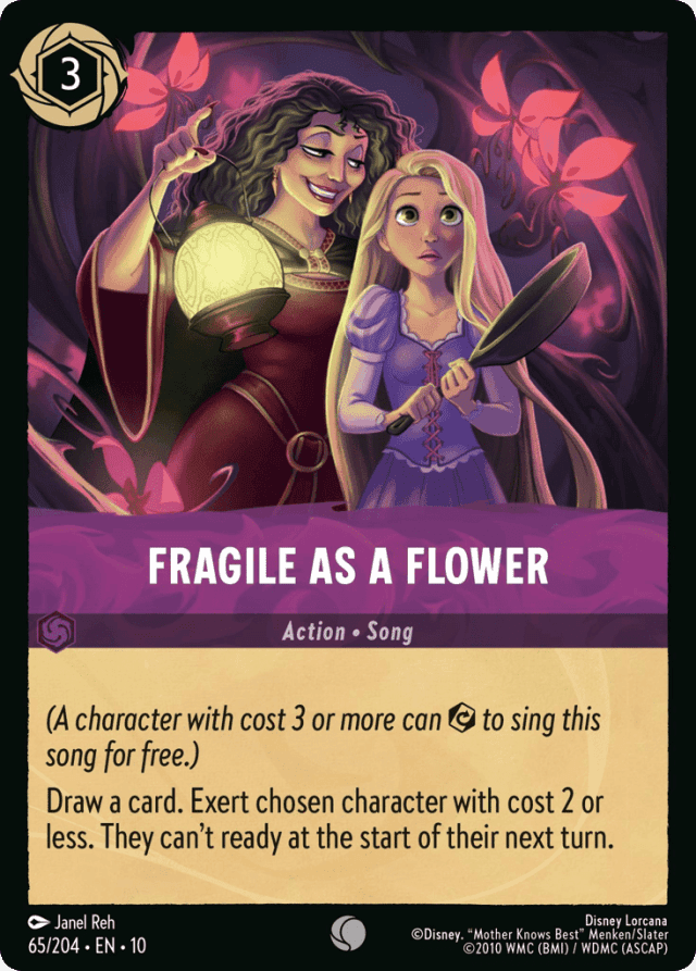 (A character with cost 3 or more can {Exert} to sing this song for free.) Draw a card. Exert chosen character with cost 2 or less. They can't ready at the start of their next turn.