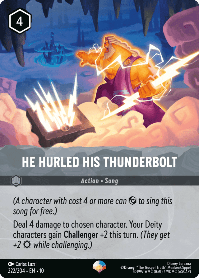 (A character with cost 4 or more can {Exert} to sing this song for free.) Deal 4 damage to chosen character. Your Deity characters gain Challenger +2 this turn. (They get +2 {Strength} while challenging.)