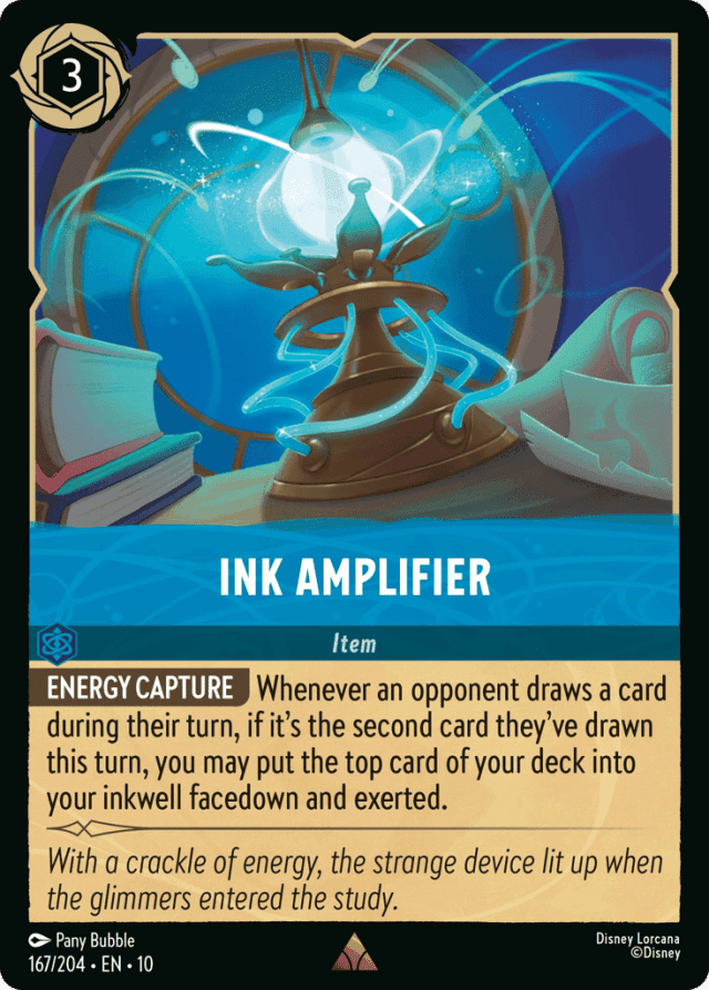 Whenever an opponent draws a card during their turn, if it's the second card they've drawn this turn, you may put the top card of your deck into your inkwell facedown and exerted.