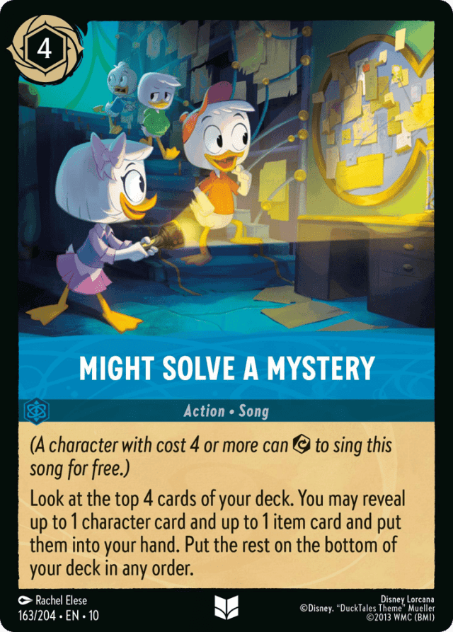 (A character with cost 4 or more can {Exert} to sing this song for free.) Look at the top 4 cards of your deck. You may reveal up to 1 character card and up to 1 item card and put them into your hand. Put the rest on the bottom of your deck in any order.