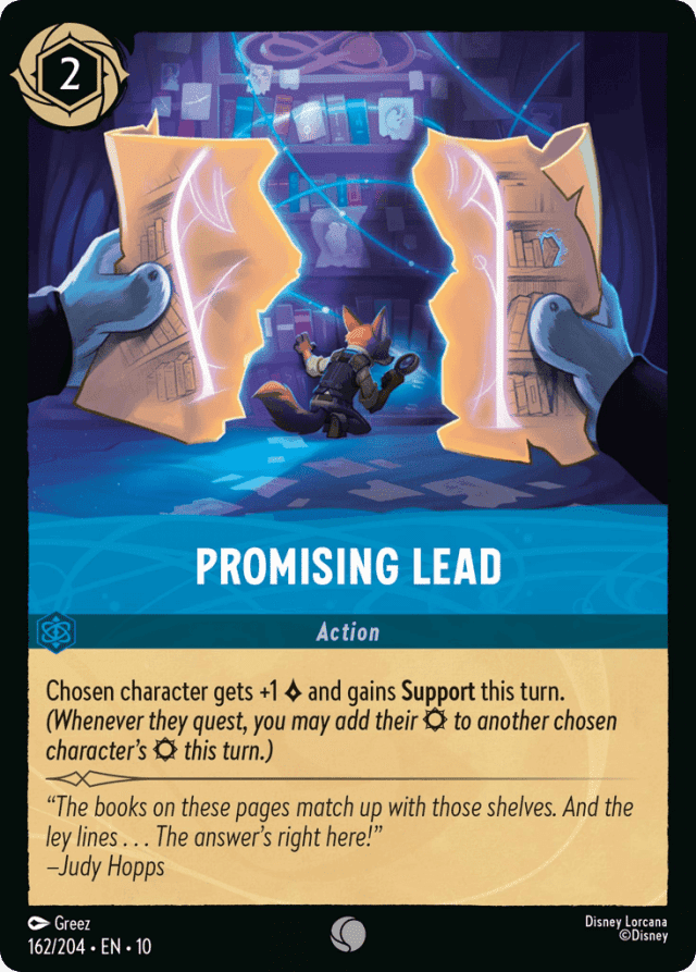 Chosen character gets +1 {Lore} and gains Support this turn. (Whenever they quest, you may add their {Strength} to another chosen character's {Strength} this turn.)