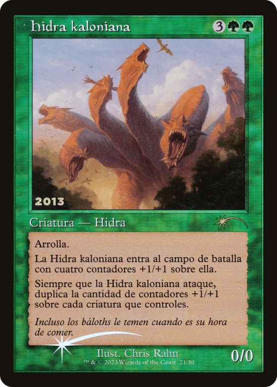 Trample This creature enters with four +1/+1 counters on it. Whenever this creature attacks, double the number of +1/+1 counters on each creature you control.