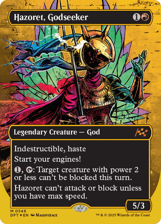 Indestructible, haste Start your engines! (If you have no speed, it starts at 1. It increases once on each of your turns when an opponent loses life. Max speed is 4.) {1}, {T}: Target creature with power 2 or less can't be blocked this turn. Hazoret can't attack or block unless you have max speed.