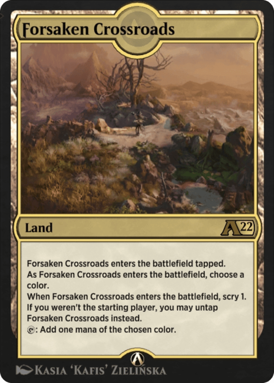Forsaken Crossroads enters the battlefield tapped. As Forsaken Crossroads enters the battlefield, choose a color. When Forsaken Crossroads enters the battlefield, scry 1. If you weren't the starting player, you may untap Forsaken Crossroads instead. {T}: Add one mana of the chosen color.