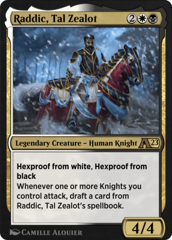 Hexproof from white and from black Whenever one or more Knights you control attack, draft a card from Raddic, Tal Zealot's spellbook.