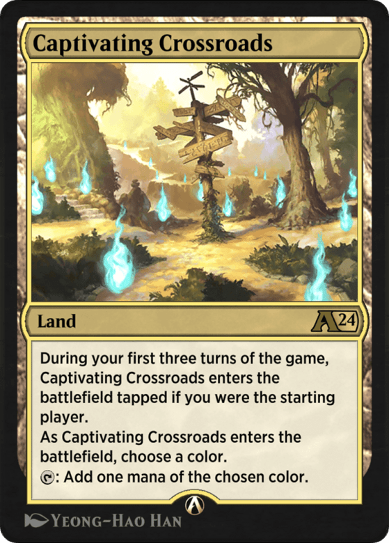 During your first three turns of the game, Captivating Crossroads enters tapped if you were the starting player. As Captivating Crossroads enters, choose a color. {T}: Add one mana of the chosen color.