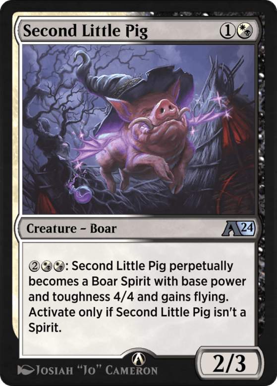 {2}{W/B}{W/B}: Second Little Pig perpetually becomes a Boar Spirit with base power and toughness 4/4 and gains flying. Activate only if Second Little Pig isn't a Spirit.