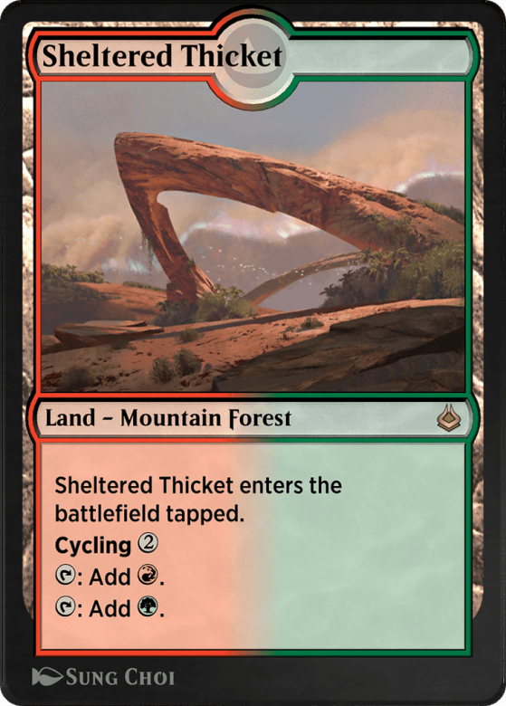 ({T}: Add {R} or {G}.) This land enters tapped. Cycling {2} ({2}, Discard this card: Draw a card.)