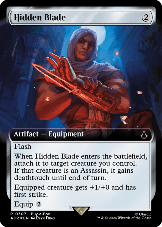 Flash When this Equipment enters, attach it to target creature you control. If that creature is an Assassin, it gains deathtouch until end of turn. Equipped creature gets +1/+0 and has first strike. Equip {2}