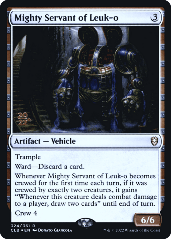 Trample Ward—Discard a card. Whenever this Vehicle becomes crewed for the first time each turn, if it was crewed by exactly two creatures, it gains "Whenever this creature deals combat damage to a player, draw two cards" until end of turn. Crew 4