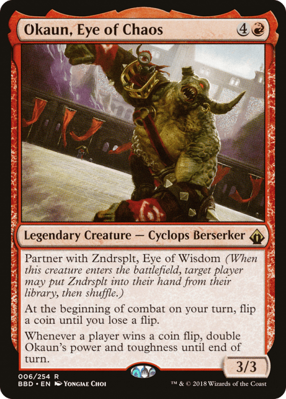 Partner with Zndrsplt, Eye of Wisdom (When this creature enters, target player may put Zndrsplt into their hand from their library, then shuffle.) At the beginning of combat on your turn, flip a coin until you lose a flip. Whenever a player wins a coin flip, double Okaun's power and toughness until end of turn.