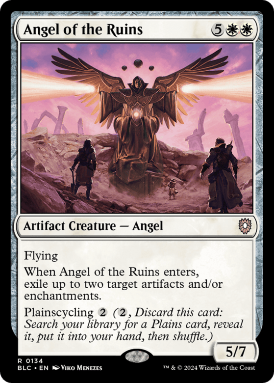 Flying When this creature enters, exile up to two target artifacts and/or enchantments. Plainscycling {2} ({2}, Discard this card: Search your library for a Plains card, reveal it, put it into your hand, then shuffle.)