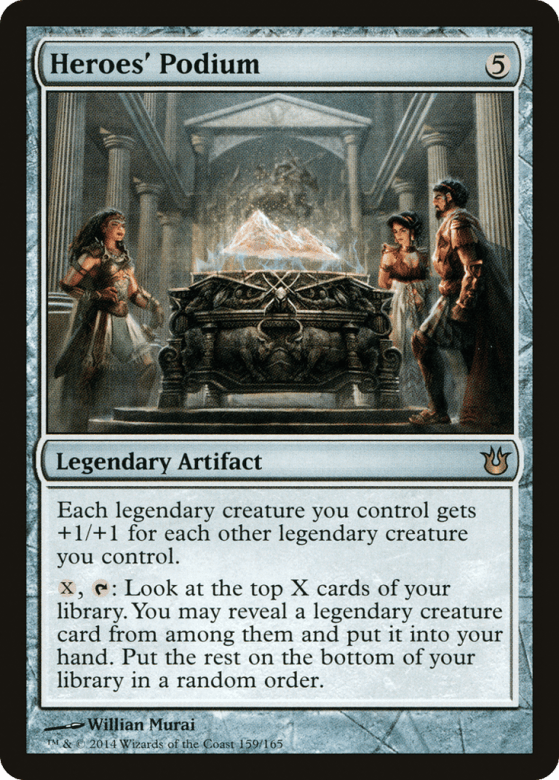 Each legendary creature you control gets +1/+1 for each other legendary creature you control. {X}, {T}: Look at the top X cards of your library. You may reveal a legendary creature card from among them and put it into your hand. Put the rest on the bottom of your library in a random order.