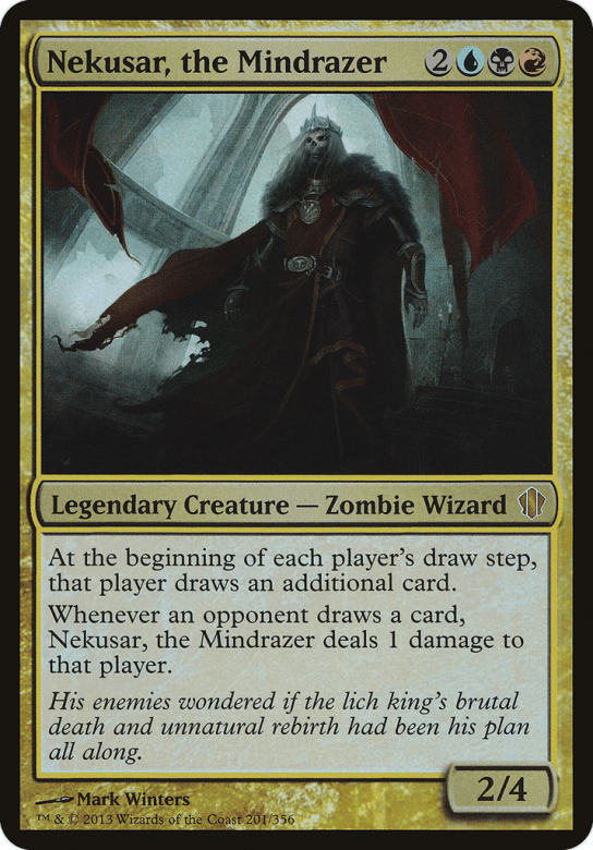 At the beginning of each player's draw step, that player draws an additional card. Whenever an opponent draws a card, Nekusar deals 1 damage to that player.
