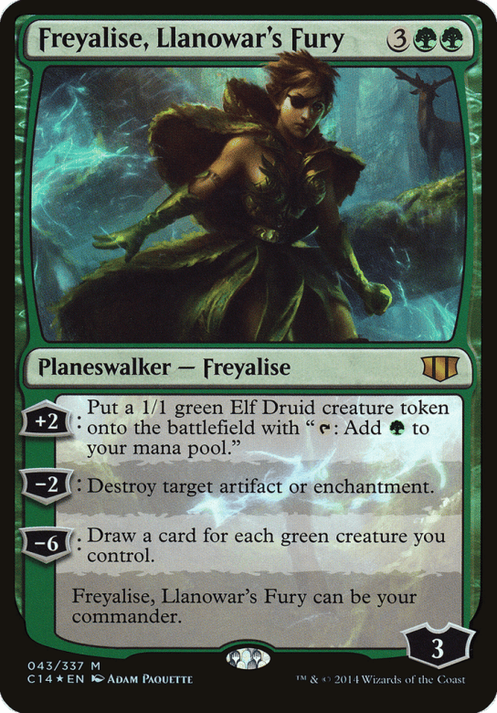 [+2]: Create a 1/1 green Elf Druid creature token with "{T}: Add {G}." [−2]: Destroy target artifact or enchantment. [−6]: Draw a card for each green creature you control. Freyalise, Llanowar's Fury can be your commander.