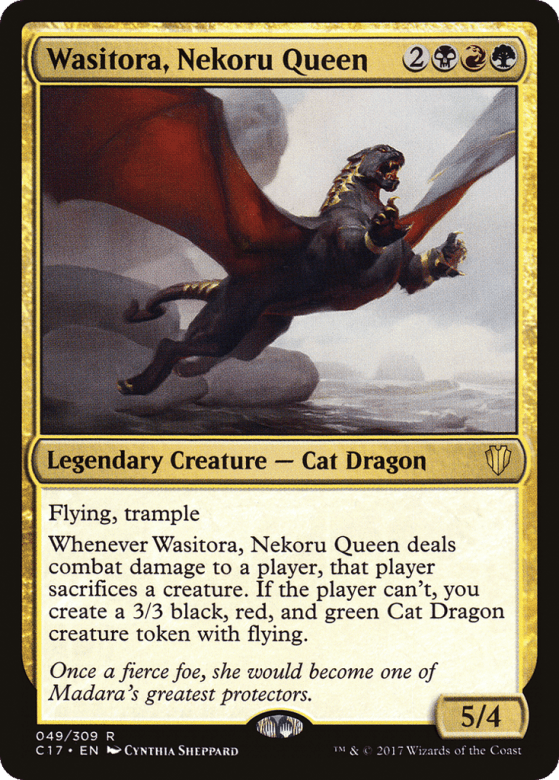 Flying, trample Whenever Wasitora deals combat damage to a player, that player sacrifices a creature of their choice. If the player can't, you create a 3/3 black, red, and green Cat Dragon creature token with flying.