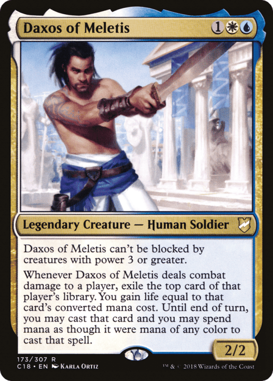 Daxos can't be blocked by creatures with power 3 or greater. Whenever Daxos deals combat damage to a player, exile the top card of that player's library. You gain life equal to that card's mana value. Until end of turn, you may cast that card and you may spend mana as though it were mana of any color to cast that spell.