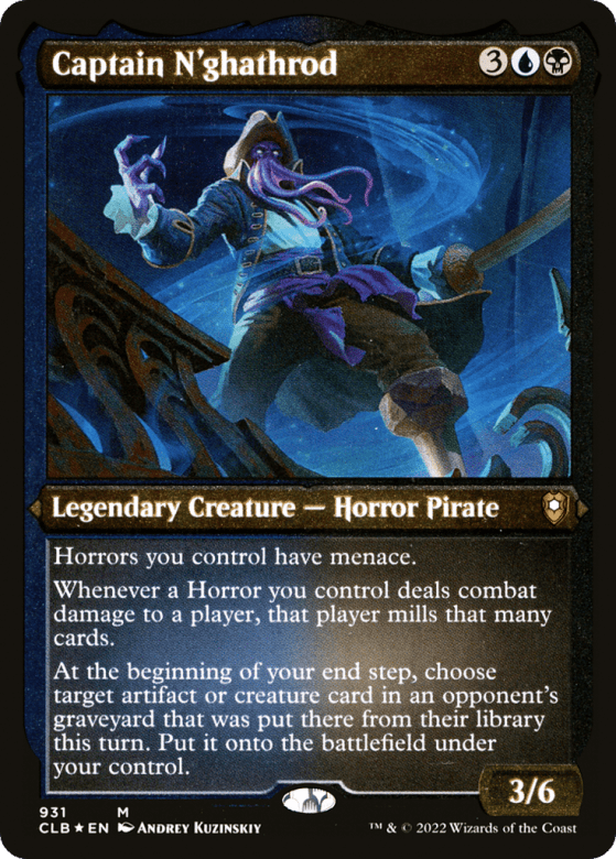 Horrors you control have menace. Whenever a Horror you control deals combat damage to a player, that player mills that many cards. At the beginning of your end step, choose target artifact or creature card in an opponent's graveyard that was put there from their library this turn. Put it onto the battlefield under your control.