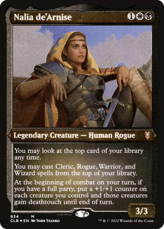 You may look at the top card of your library any time. You may cast Cleric, Rogue, Warrior, and Wizard spells from the top of your library. At the beginning of combat on your turn, if you have a full party, put a +1/+1 counter on each creature you control and those creatures gain deathtouch until end of turn.