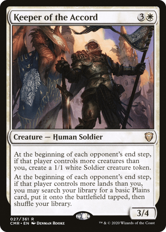At the beginning of each opponent's end step, if that player controls more creatures than you, create a 1/1 white Soldier creature token. At the beginning of each opponent's end step, if that player controls more lands than you, you may search your library for a basic Plains card, put it onto the battlefield tapped, then shuffle.