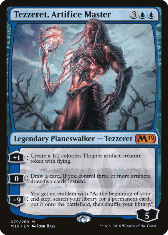 [+1]: Create a 1/1 colorless Thopter artifact creature token with flying. [0]: Draw a card. If you control three or more artifacts, draw two cards instead. [−9]: You get an emblem with "At the beginning of your end step, search your library for a permanent card, put it onto the battlefield, then shuffle."