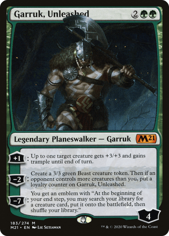 [+1]: Up to one target creature gets +3/+3 and gains trample until end of turn. [−2]: Create a 3/3 green Beast creature token. Then if an opponent controls more creatures than you, put a loyalty counter on Garruk. [−7]: You get an emblem with "At the beginning of your end step, you may search your library for a creature card, put it onto the battlefield, then shuffle."