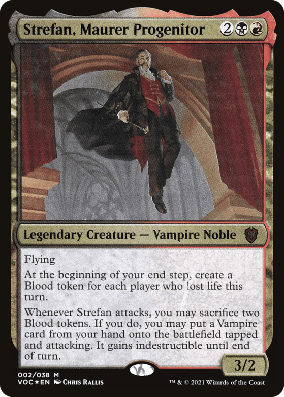 Flying At the beginning of your end step, create a Blood token for each player who lost life this turn. Whenever Strefan attacks, you may sacrifice two Blood tokens. If you do, you may put a Vampire card from your hand onto the battlefield tapped and attacking. It gains indestructible until end of turn.