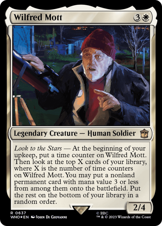Look to the Stars — At the beginning of your upkeep, put a time counter on Wilfred Mott. Then look at the top X cards of your library, where X is the number of time counters on Wilfred Mott. You may put a nonland permanent card with mana value 3 or less from among them onto the battlefield. Put the rest on the bottom of your library in a random order.