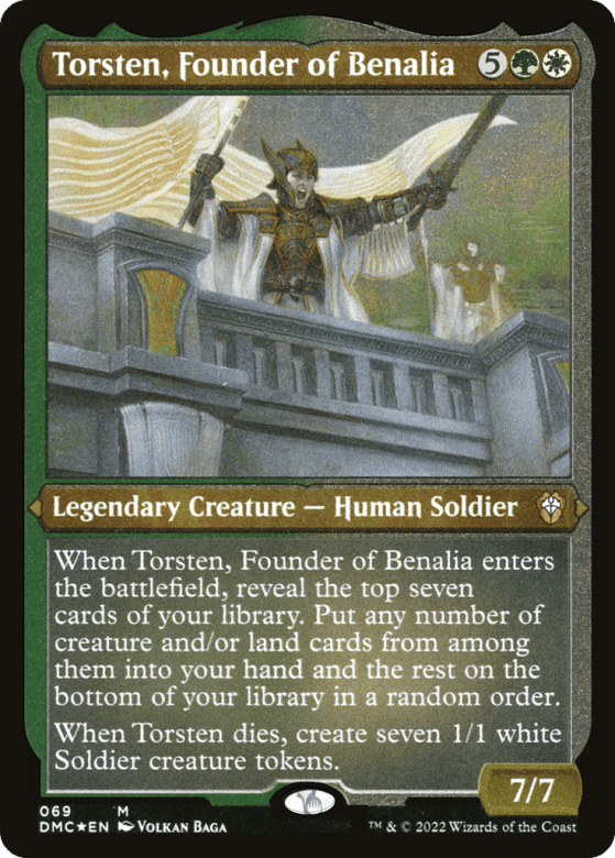 When Torsten enters, reveal the top seven cards of your library. Put any number of creature and/or land cards from among them into your hand and the rest on the bottom of your library in a random order. When Torsten dies, create seven 1/1 white Soldier creature tokens.