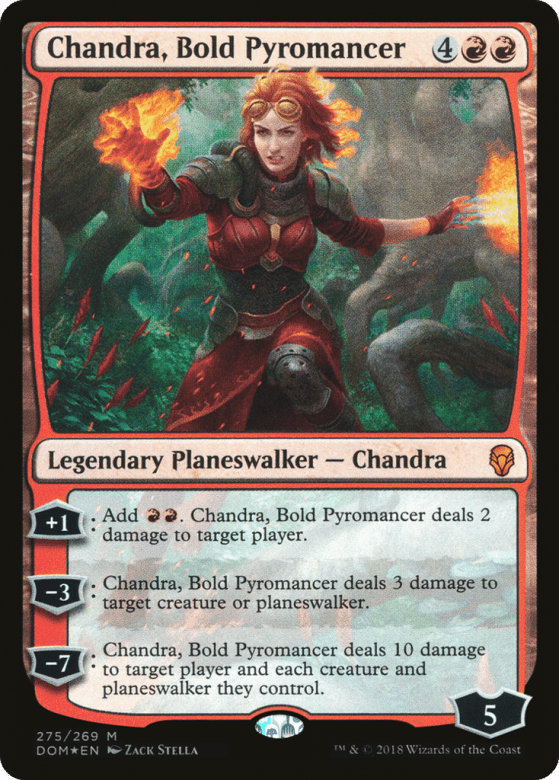 [+1]: Add {R}{R}. Chandra deals 2 damage to target player. [−3]: Chandra deals 3 damage to target creature or planeswalker. [−7]: Chandra deals 10 damage to target player and each creature and planeswalker they control.