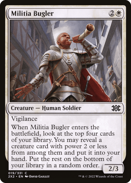 Vigilance (Attacking doesn't cause this creature to tap.) When this creature enters, look at the top four cards of your library. You may reveal a creature card with power 2 or less from among them and put it into your hand. Put the rest on the bottom of your library in a random order.