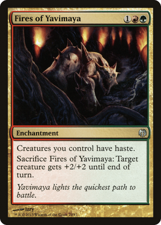 Creatures you control have haste. Sacrifice this enchantment: Target creature gets +2/+2 until end of turn.