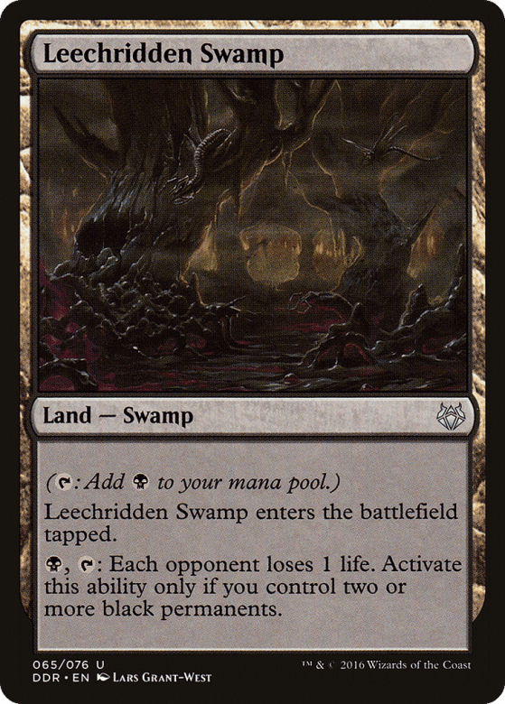 ({T}: Add {B}.) This land enters tapped. {B}, {T}: Each opponent loses 1 life. Activate only if you control two or more black permanents.