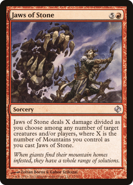 Jaws of Stone deals X damage divided as you choose among any number of targets, where X is the number of Mountains you control as you cast this spell.