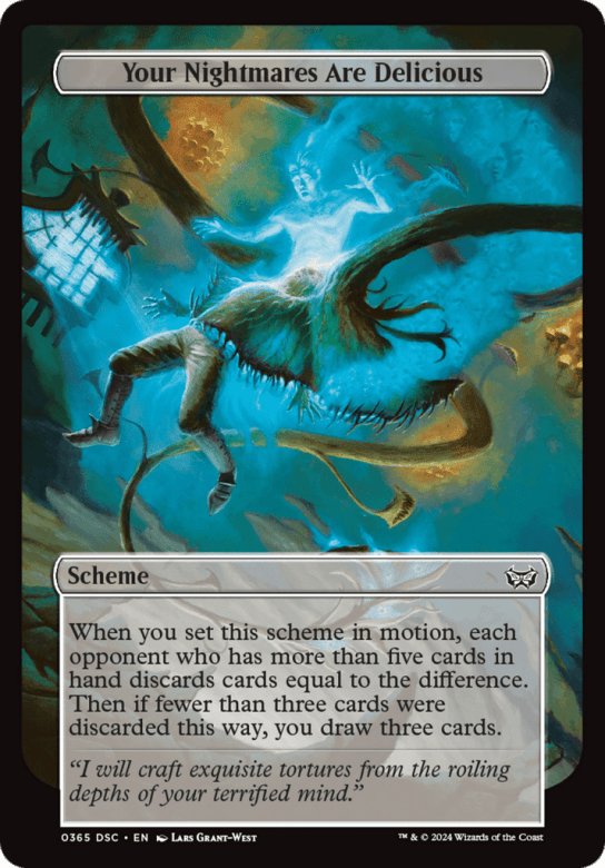 When you set this scheme in motion, each opponent who has more than five cards in hand discards cards equal to the difference. Then if fewer than three cards were discarded this way, you draw three cards.